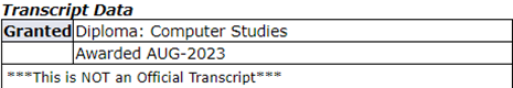 Students requiring proof of graduation or applying for a post-graduation work permit (PGWP) should wait until the transcript includes the credential awarded (graduation) notation. This notation appears on your transcript when your graduation application has been finalized. Please ensure your transcript has been updated prior to downloading your unofficial transcript or ordering an official transcript.